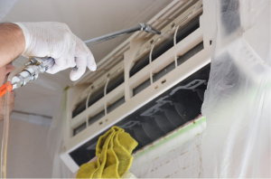 Menurunkan unit indoor AC, melakukan pembersihan kotoran secara menyeluruh, termasuk di evaporator coil dan blower pada bagian belakang yang tidak tersentuh pada saat pencucian AC biasa serta membersihkan unit outdoor dan memeriksa tekanan gas freon.